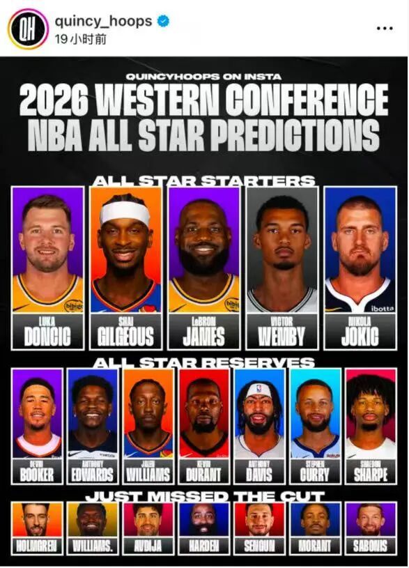 而且,在美媒Quincy Hoops预测的25-26赛季东西部全明星名单中,詹姆斯携手东契奇依旧首发!除了湖人双子星之外,亚历山大、文班和约基奇,而杜兰特与库里将以替补身份进入全明星。